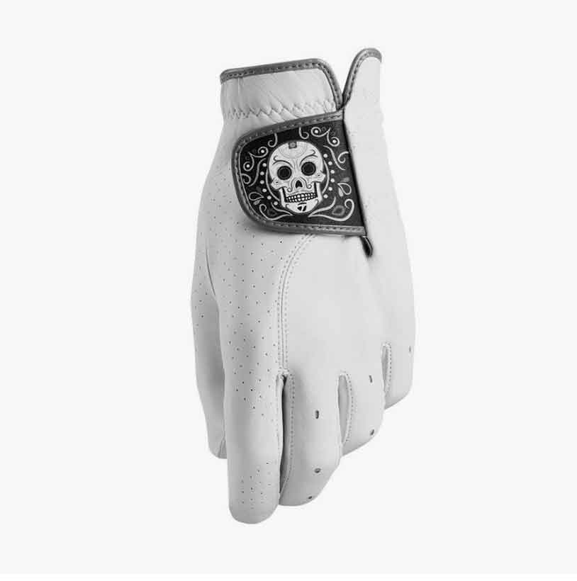 The Tour Preferred glove ($29.99) is constructed with AAA Cabrera Soft Tech leather, stretch fit tab adjustment and a moisture-wicking wristband, with the sugar skull on display on the tab.