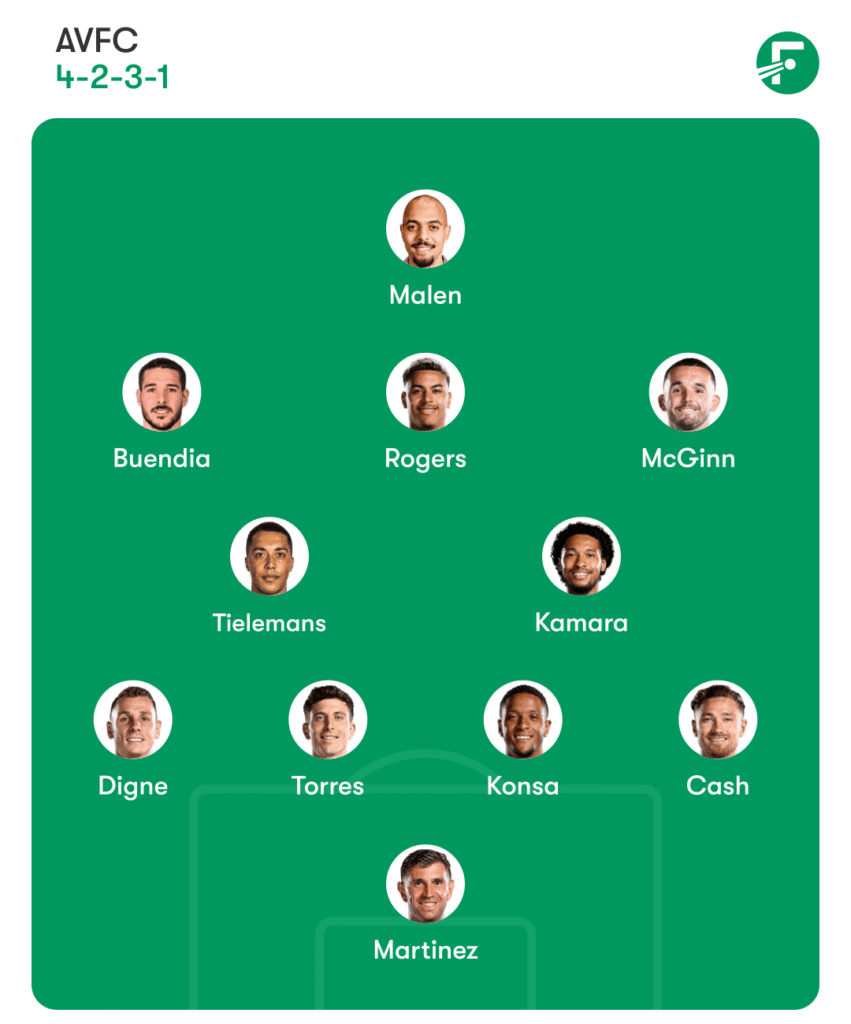 I think Onana will be the man who misses out in midfield with Youri Tielemans and Boubacar Kamara playing in a double pivot and John McGinn operating on the right.