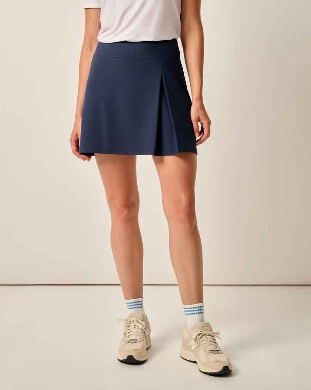 Finding a golf skirt that fits just right is a tough ask — especially for someone with a short frame like me. Length is a delicate balance — an inch too long looks frumpy, too short just feels wrong once you turn a certain age. Finding that perfect middle ground feels like a victory, and this Johnnie-O skirt wins the prize. I’m a fan of many pieces in their newly-launched women’s collection, but this skirt became a fast favorite. It is so flattering, with comfy, snug and stretchy fit, front pleat and fun contrast undershorts.
